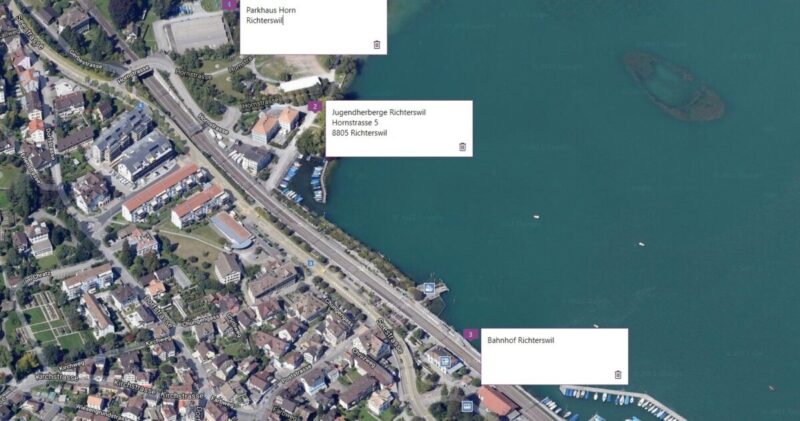 Die Jugendherberge Richterswil liegt direkt am Zürichsee neben dem Bahnhof Richterswil, Parkplätze im Parkhaus Horn (neben der Jugendherberge) sind genügend vorhanden, von der Autobahnausfahrt Richterswil ist man in 5 Minuten am See unten.