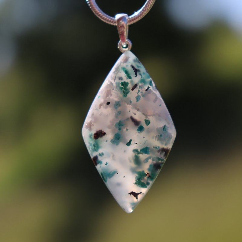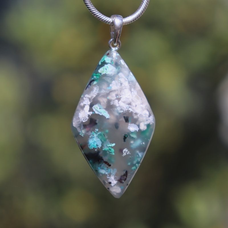 Dieser Calcedon ist eine Rarität, in ihm findet sich Chrysokoll, oft mit Malachit, Azurit, Cuprit und kleinen Kupferadern. Dadurch wirkt der Stein wie Unterwasserlandschaft. Dieser Stein wurde im April 2022 auf den Indonesischen Maluka-Inseln entdeckt, als bei Strassenarbeiten ein grosser Felsen aufgebrochen wurde und die glitzernden Kupferadern entdeckt wurden.