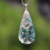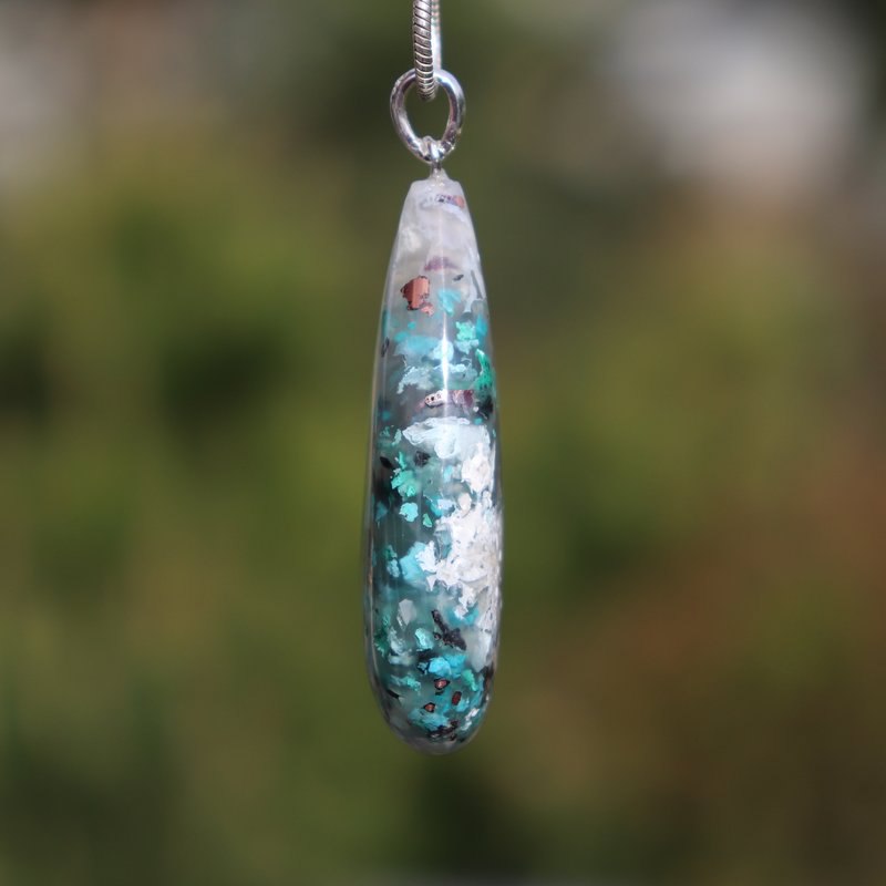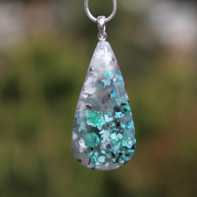Dieser Calcedon ist eine Rarität, in ihm findet sich Chrysokoll, oft mit Malachit, Azurit, Cuprit und kleinen Kupferadern. Dadurch wirkt der Stein wie Unterwasserlandschaft. Dieser Stein wurde im April 2022 auf den Indonesischen Maluka-Inseln entdeckt, als bei Strassenarbeiten ein grosser Felsen aufgebrochen wurde und die glitzernden Kupferadern entdeckt wurden.