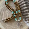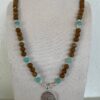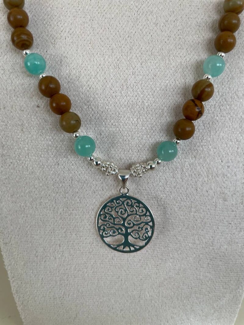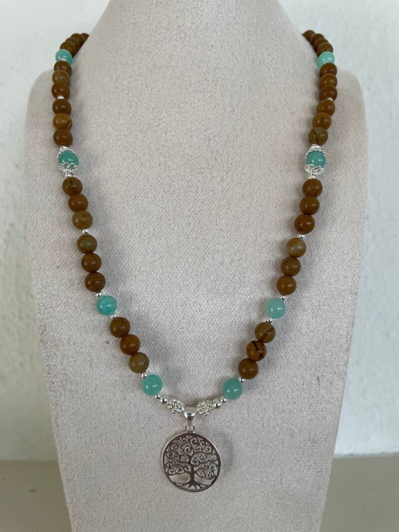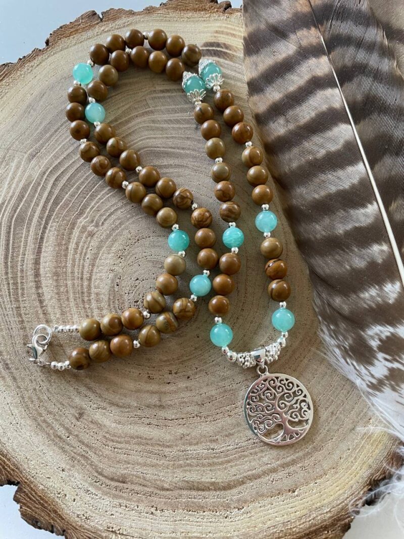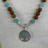 Halskette aus Amazonit und Holzperlen, mit dem Baum des Lebens