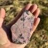 Dieser wunderschöne Rhodonit-Rohstein wurde gesägt und beidseitig geschliffen. Der Stein wiegt 164g und seine Masse sind 1,5x5x9cm.