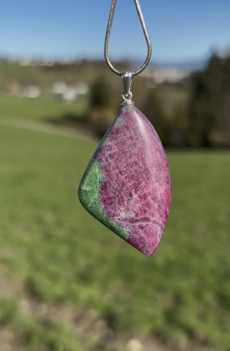 Dieser wunderschöne Rubin-Zoisit Anhänger ist 30x49mm gross, 30g schwer und hat eine 925 Silberöse.