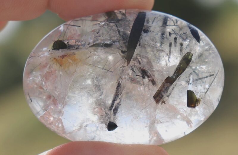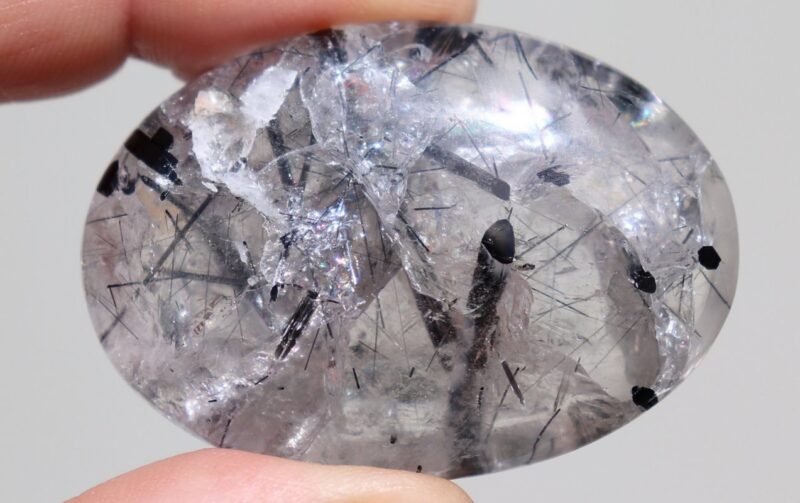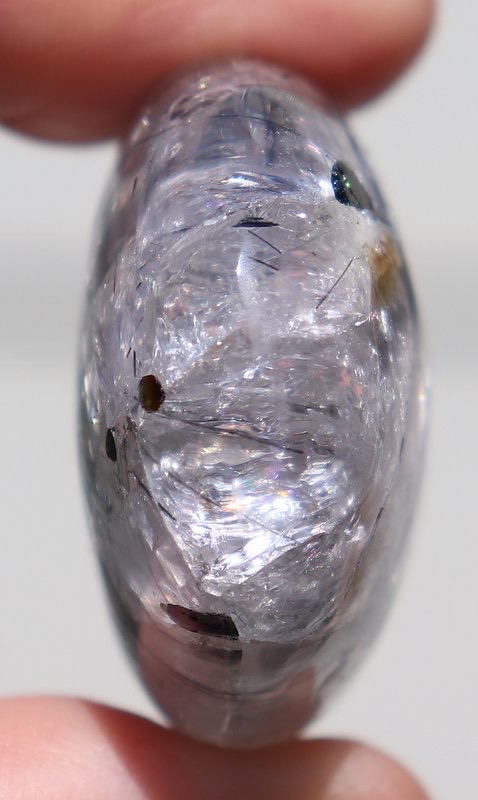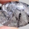 Dieser wundervolle Quarz-Handschmeichler mit Turmalinnadeln hat einen wunderschönen Schimmer und vielen Regenbögen, er ist 18x37x54mm gross.