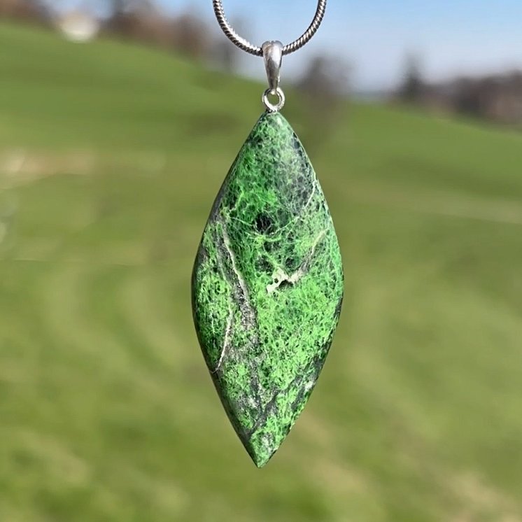 Dieser seltene Uwarovit-Anhänger aus der Schweiz ist 20x48mm gross und hat eine 925 Silberöse